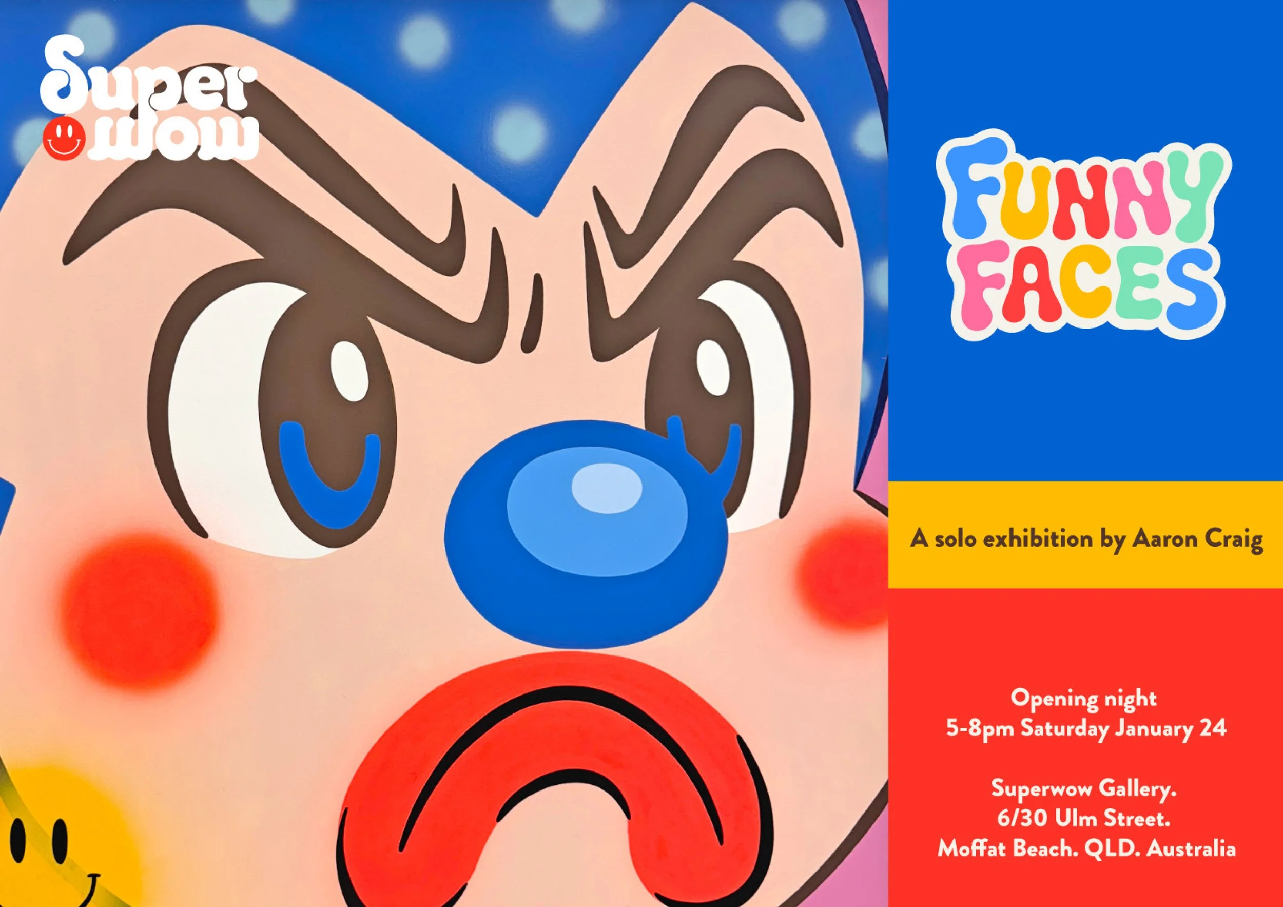 Superwow Gallery presents Funny Faces. A solo exhibition by Australian pop artist Aaron Craig. This vibrant body of work is defined by saturated colour, joyful cartoon elements, and nostalgic character-building. Drawing from cartoons, toys, and pop ephemera, Aaron creates a cast of characters that feel instantly familiar while remaining unmistakably his own—playful, iconic, and culturally inspired.